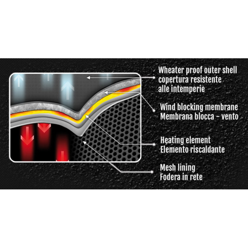 3-Tecnologia leggera= Batteria agli ioni di litio piccola, leggera e ricaricabile velocemente. Posizionata in una piccola tasca interna, può alimentare il circuito scaldante per più di 5 ore.